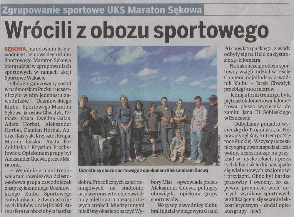 Na zakończenie obozu wzieliśmy udział w teście Coopera, najmłodszy Jarek Chwałyk przebiegł 3100m. Jedną z form treningu była 15 km piesza wycieczka do zamku Jana III Sobieskiego w Rzucewie. Odbyliśmy wycieczkę do Trójmiasta, na Hel oraz przejażdżka kutrem po Zatoce Puckiej. Wszyscy uczestnicy zgrupowania spędzali czas wolny uczestnicząc w organizowanych dyskotekach i przez te kilkanaście dni nawiązało się wiele nowych znajomości i przyjaźni. Obóz był bardzo pracowity i owocny, co zapewne przyniesie wiele dobrych wyników sportowych w zbliżającym się sezonie lekkoatletycznym.