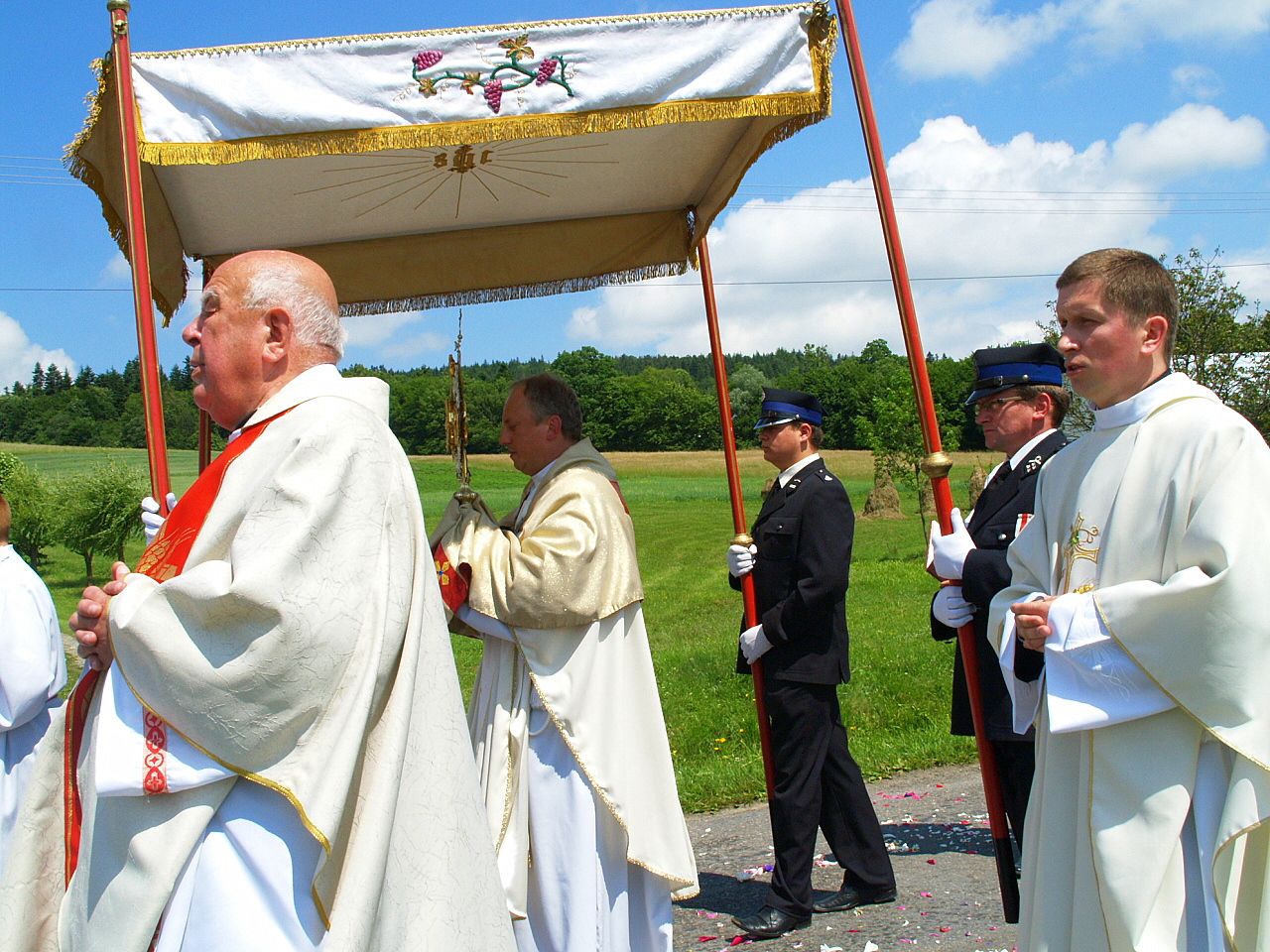 Dziś Boże Ciało - uroczystość Najświętszego Ciała i Krwi Chrystusa W uroczystości uczestniczyli licznie zgromadzeni mieszkańcy Parafii Sękowa. Święto Bożego Ciała zostało ustanowione w 1264 roku przez papieża Urbana IV. Głównym celem obchodów Bożego Ciała jest publiczne wyznanie wiary w obecność Jezusa Chrystusa w Najświętszym Sakramencie, oddanie mu czci i podziękowanie za łaski, niesionym w procesji do czterech ołtarzy. W Polsce Boże Ciało obchodzi się w czwartek po oktawie Zesłania Ducha Świętego, a więc jest to święto ruchome wypadające zawsze 60 dni po Wielkanocy.